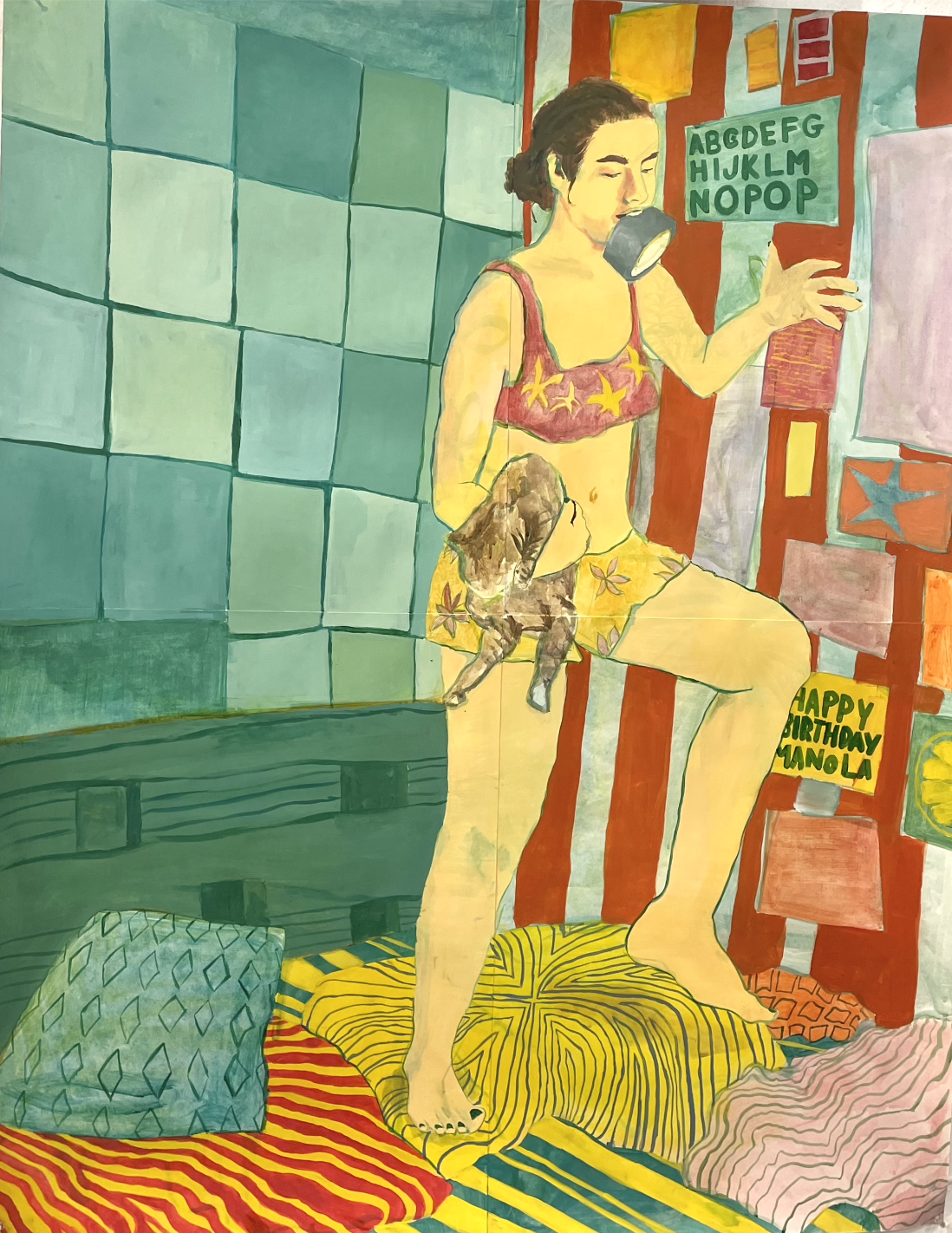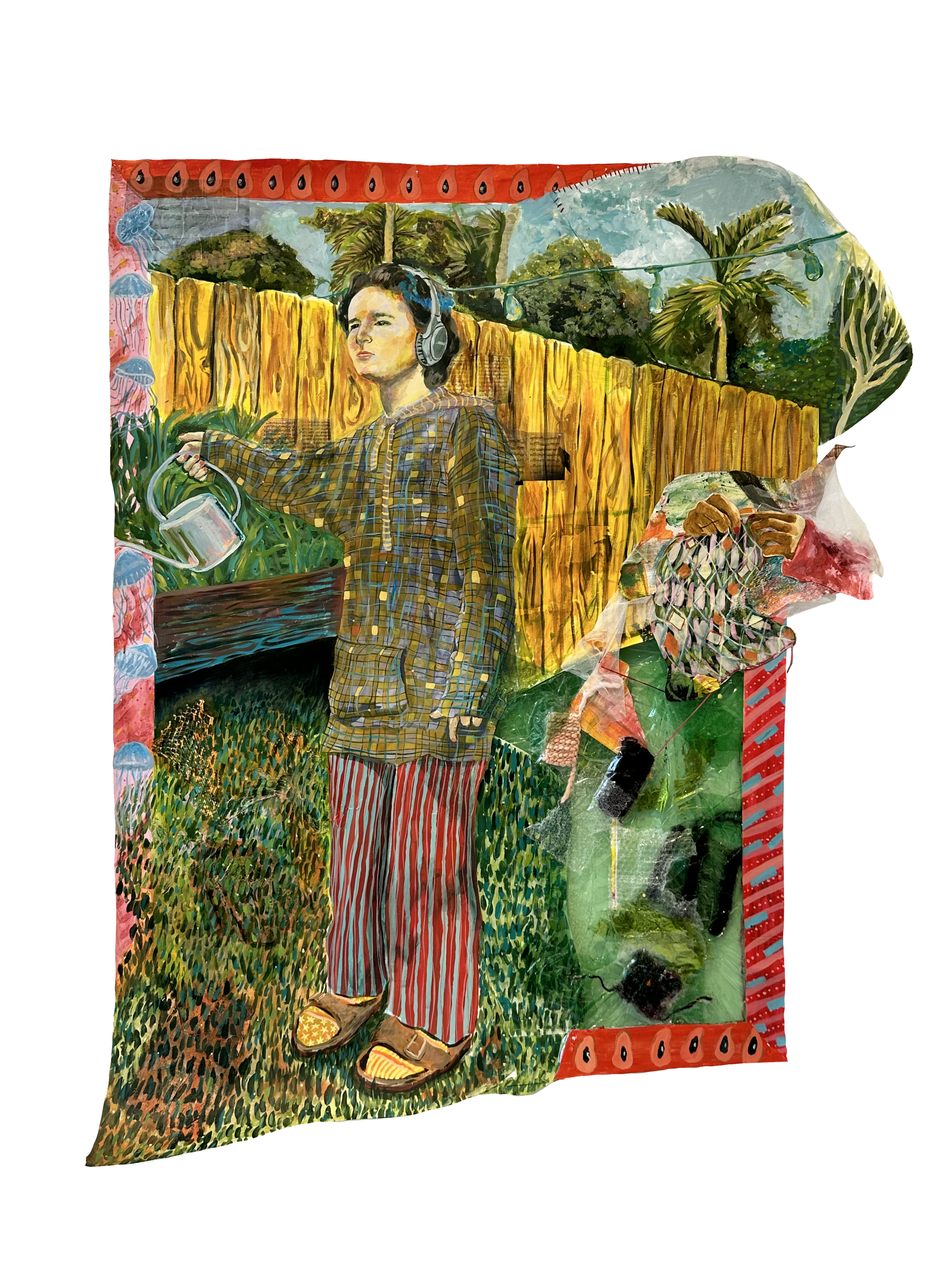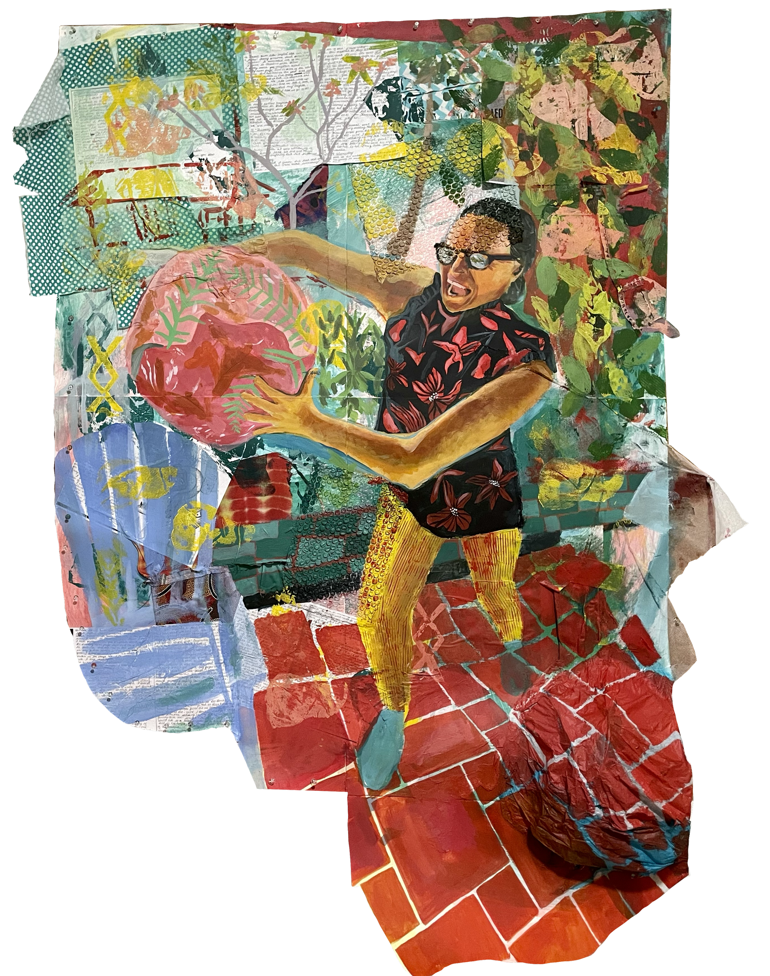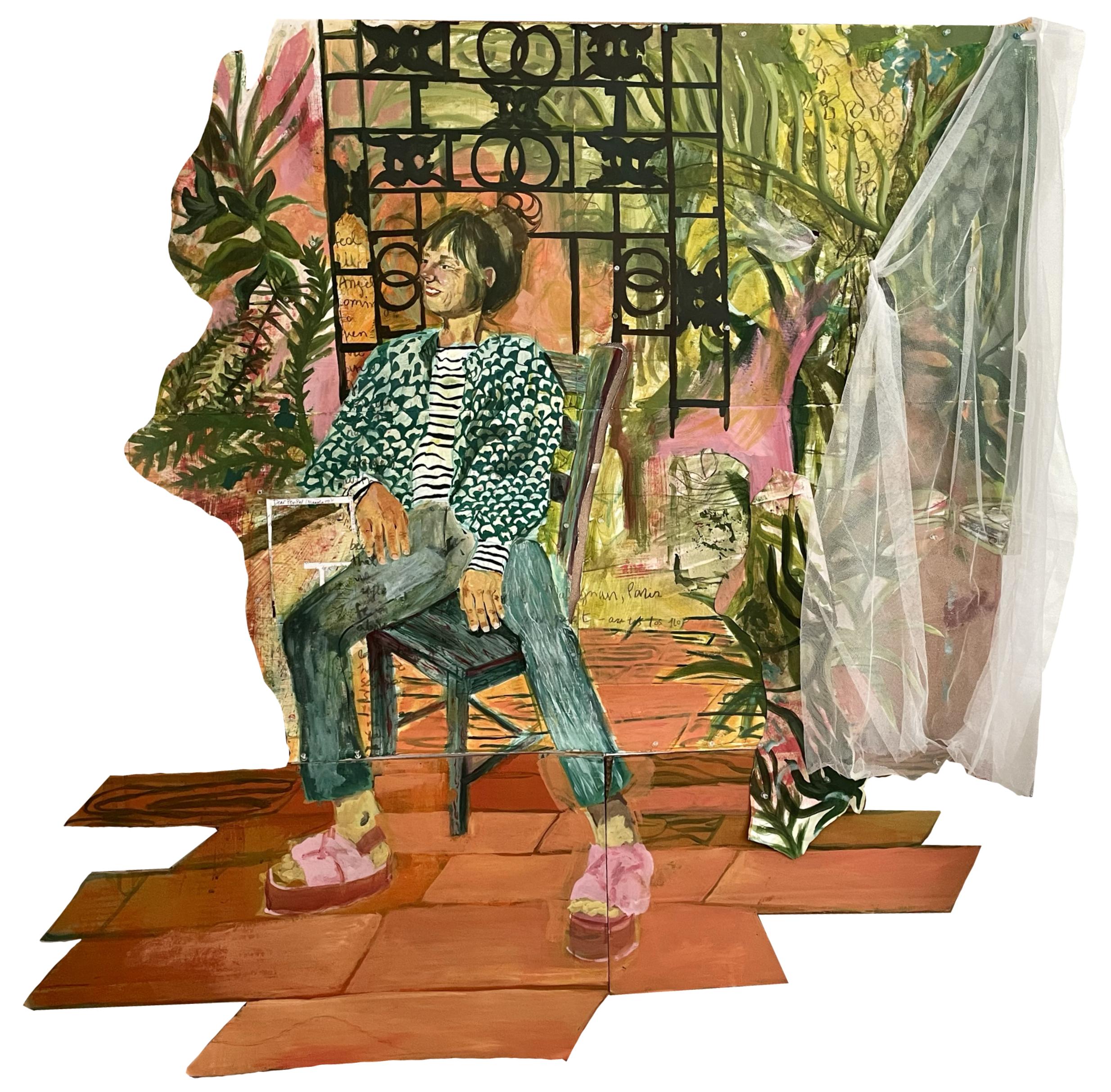Acrylic, paper, cardboard, curtain drapes, charcoal, and a old PenPal letter